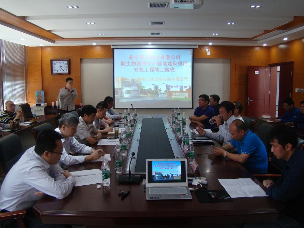 2017年5月10日下午,新宇藥業微生物藥物生產基地項目安裝工程竣工驗收會議在新宇藥業股份有限公司召開,新宇藥業股份有限公司總經理萬曉飛、總工程師朱立元、總會計師蔣峰、項目總指揮李利、副總指揮李民、陳海軍以及相關部門同志參加會議,安徽安裝公司黨委書記胡六中、副總經理劉安俊、紀委書記李寬旭、總會計師張元斌、總工程師吳繼成等應邀出席。